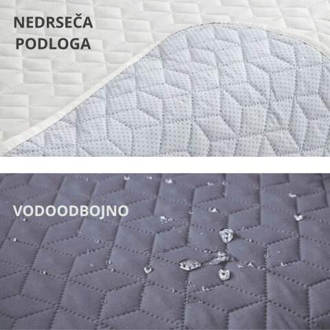 Podloga je izdelana iz visokokakovostne tkanine, ki je obdelana s posebnim vodoodbojnim premazom. To pomeni, da material učinkovito odbija vodo, kar omogoča enostavno odstranjevanje manjših madežev in ohranjanje čistoče. Vendar je pomembno upoštevati, da prevleka ni popolnoma vodoodporna, kar pomeni, da lahko v primeru daljšega stika z vodo ali v primeru velikih količin tekočine le-te vpije.