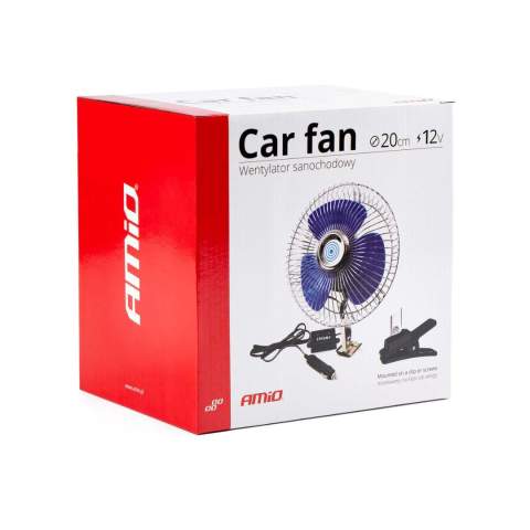 Kovinski avtomobilski ventilator, ki ga napaja 12V vtičnica za cigaretni vžigalnik. Montaža s sponkami ali vijaki.